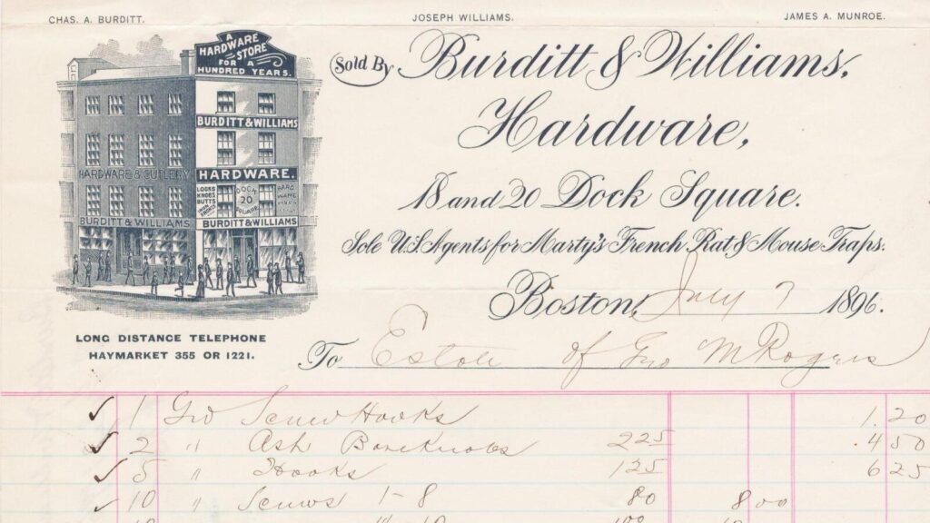 Facture commerciale d’une page émise par l’entreprise de quincaillerie « Burditt & Williams », située au 18 et 20 Dock Square, Boston. L’en-tête du document comporte une représentation graphique imprimée du bâtiment de l’entreprise avec l’inscription d’époque « Hardware ». Sous l’en-tête, il est indiqué que l’entreprise est le représentant exclusif américain des Marty’s French Rat & Mouse Traps. La partie manuscrite indique le destinataire et la liste détaillée des articles.